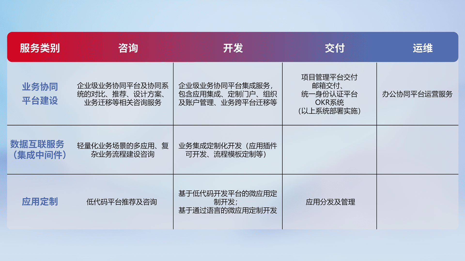 针对钉钉、、、、企微、、、IDaas等平台级产品提供产品的规划、、、、方案、、交付、、、、定制化开发等服务,,,,实现如统一协同办公、、、智能客户服务、、混合会议管理、、、、智能数据查询、、、等业务场景,,,实现数字化转型。。。