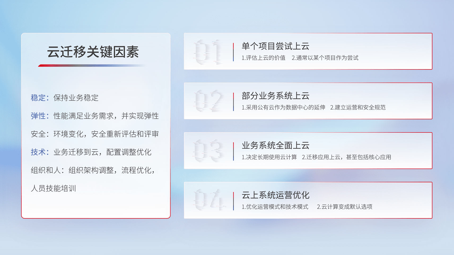 结合实际业务,,,从规划设计、、、、云平台选型、、云原生改造、、数据迁移、、集成交付,,迁移全过程为客户识别最佳上云路径,,,做好风险识别管理,,,,设计网络架构、、身份权限、、、、安全审计合规、、、、操作审计、、日志审计、、监控告警策略、、、多站点容灾设计等,,,对云上基础设施进行整体规划,,,提升IT治理水平,,,,以满足弹性、、高可用、、、高性能的需求。。。。
