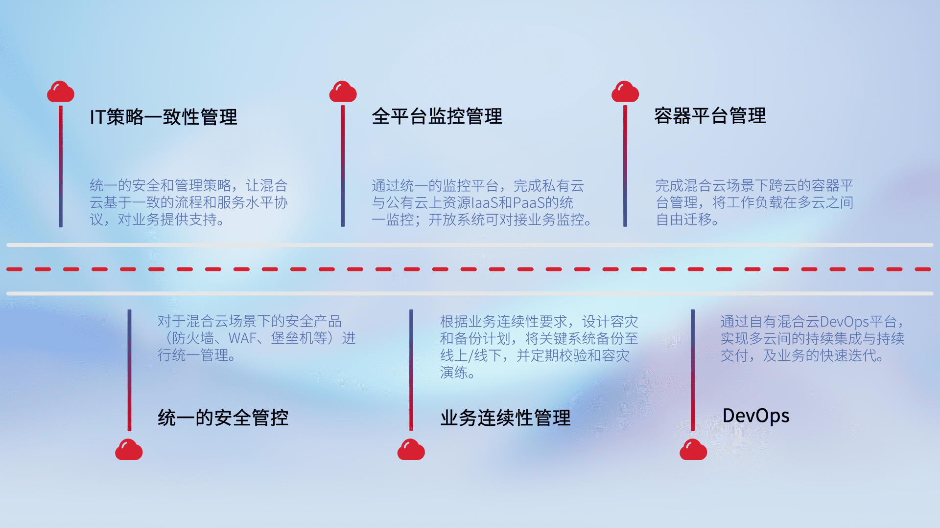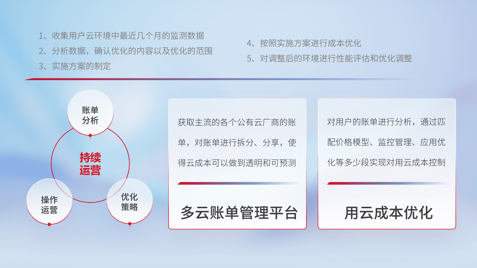 通过多云纳管,,,,以统一的资源数据模型把客户的云资源进行抽象和封装,,,,进而实现对多云资源的统一操作,,,保障云资源管理的可靠性、、、稳定性与可用性。。量身定制化运维内容,,配置、、、开发运维、、、、补丁管理、、备份、、、、监控、、、、认证和访问管理、、审计和日常巡检等,,保障在用云过程中的可靠度,,稳定度以及高可用率。。。